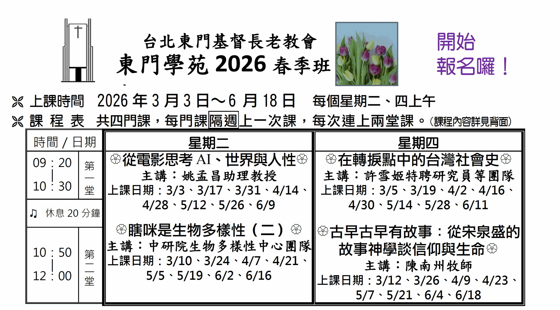 上課時間: 2026 年 3 月 3 日~6 月 18 日 每個星期二、四上午。